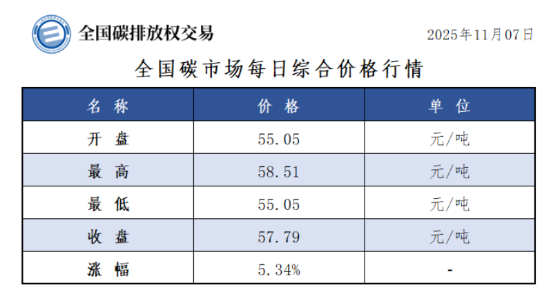 今日全国碳市场综合价格行情为: 开盘价55.05元/吨,最高价58.51元/吨,最低价55.05元/吨,收盘价57.79元/吨,收盘价较前一日上涨5.34%。