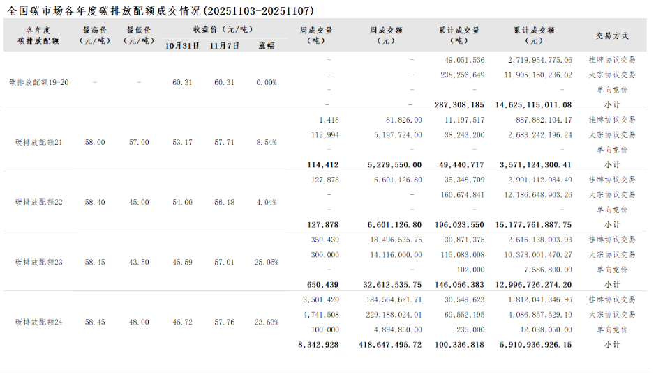 2025年1月1日至11月7日,全国碳市场碳排放配额成交量148,896,989吨,成交额9,248,937,296.08元。