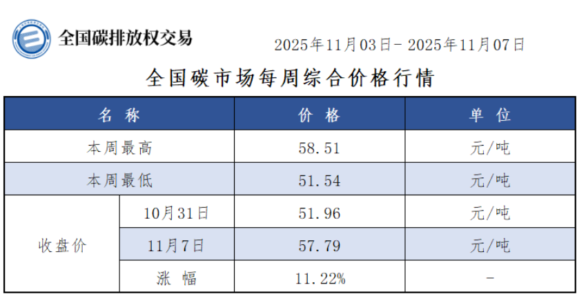 本周全国碳市场综合价格行情为:最高价58.51元/吨,最低价51.54元/吨,收盘价较上周五上涨11.22%。