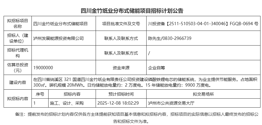 11月7日,四川金竹纸业分布式储能项目招标计划公告发布,预计招标时间12月8日。项目招标人为泸州市国资企业泸州发展能源投资有限公司,项目拟在四川省纳溪区 321 国道四川金竹纸业有限责任公司投资建设磷酸铁锂电芯的储能系统,为业主提供节能服务。占地面积 300㎡。装机规模 20MWh。日均储能放电量约:2 万度电。15 年储能放电量约:9900 万度电。
