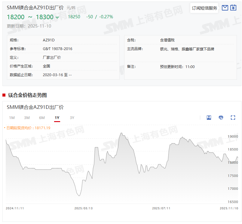 镁合金AZ91D11月10日的均价为18250元/吨,较其前一交易日下跌0.27%。上周镁合金价格随原镁价格持续阴跌,但合金加工费保持坚挺。从市场供需来看,短期内镁合金市场呈现结构性失衡,生产端开工率持续高位,供应紧张局面已适度缓和,但多数企业仍按订单排产,部分厂家排单已至 11 月中旬。展望后期,随着上游镁合金厂家加紧投产,供应紧缺格局将有效缓解,而当前下游压铸厂对加工费上调接受度不高,预计短期加工费仍将坚挺运行,后期则存在回落风险。