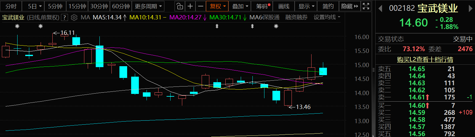 11月10日,宝武镁业股价出现下跌,截至10日11:10分,宝武镁业跌1.88%,报14.6元/股。