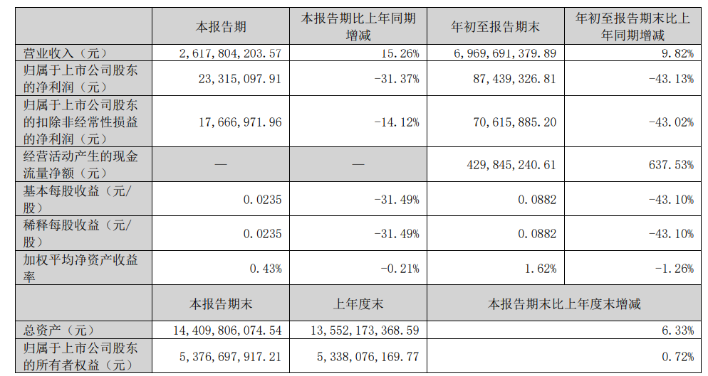 宝武镁业10月28日披露2025年第三季度报告。前三季度公司实现营业总收入69.7亿元,同比增长9.82%;归母净利润8743.93万元,同比下降43.13%;扣非净利润7061.59万元,同比下降43.02%。