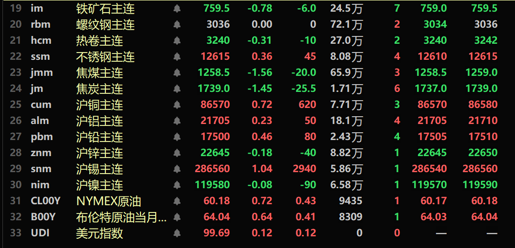 截至11月10日11:40分,部分期货午间行情: