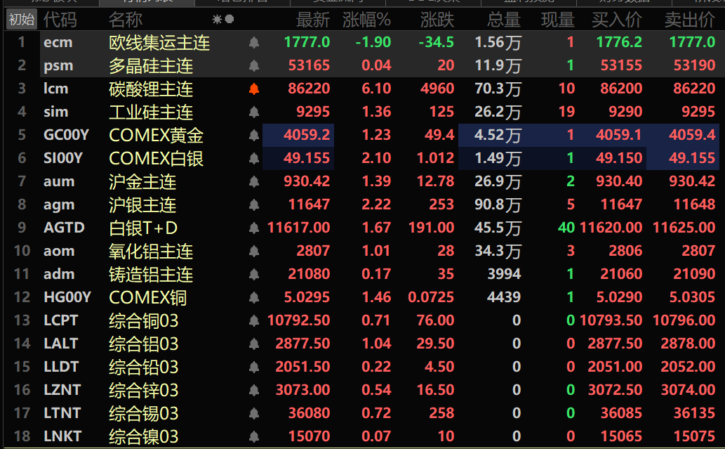 此外,铸造铝主连期货涨0.17%,氧化铝主连涨1.01%。碳酸锂主连涨6.1%,工业硅主连涨1.36%。多晶硅主连涨0.04%。