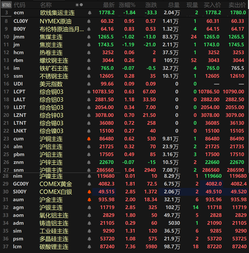 此外,碳酸锂主连大涨7.36%,录得四连阳。多晶硅涨1.08%,工业硅涨1.31%。欧线集运主连跌1.84%报1778.2。