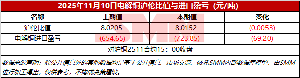 2025年11月10日电解铜沪伦比值与进口盈亏【SMM价格】