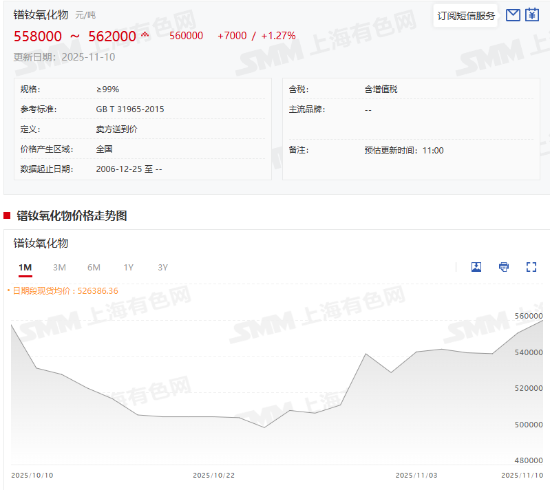 11月10日,稀土产业链价格整体小幅上涨。其中,氧化物市场方面,氧化镨钕价格上调至55.8-56.2万元/吨,氧化镝价格下调至153-156万元/吨,氧化铽价格稳定在660-665万元/吨,氧化钆价格上调至16-16.3万元/吨;氧化钬价格稳定在49.8-50.2万元/吨,氧化铒价格继续在33.6-33.8万元/吨之间波动。