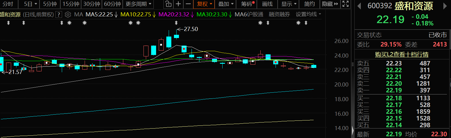 11月10日,盛和资源的股价小幅下跌,截至10日收盘,盛和资源跌0.18%,报22.19元/股。