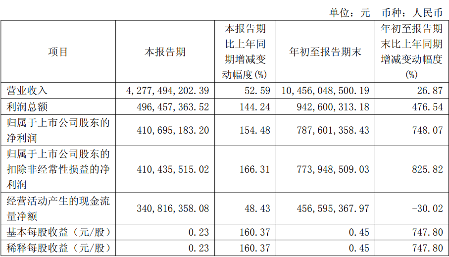 10月30日晚间,盛和资源披露2025年第三季度报告。公司前三季度实现营业收入104.56亿元,同比增长26.87%;实现归母净利润7.88亿元,同比增长748%。单季度来看,公司第三季度营业收入为42.77亿元,同比增长52.59%;归母净利润为4.11亿元,同比增长154.48%。