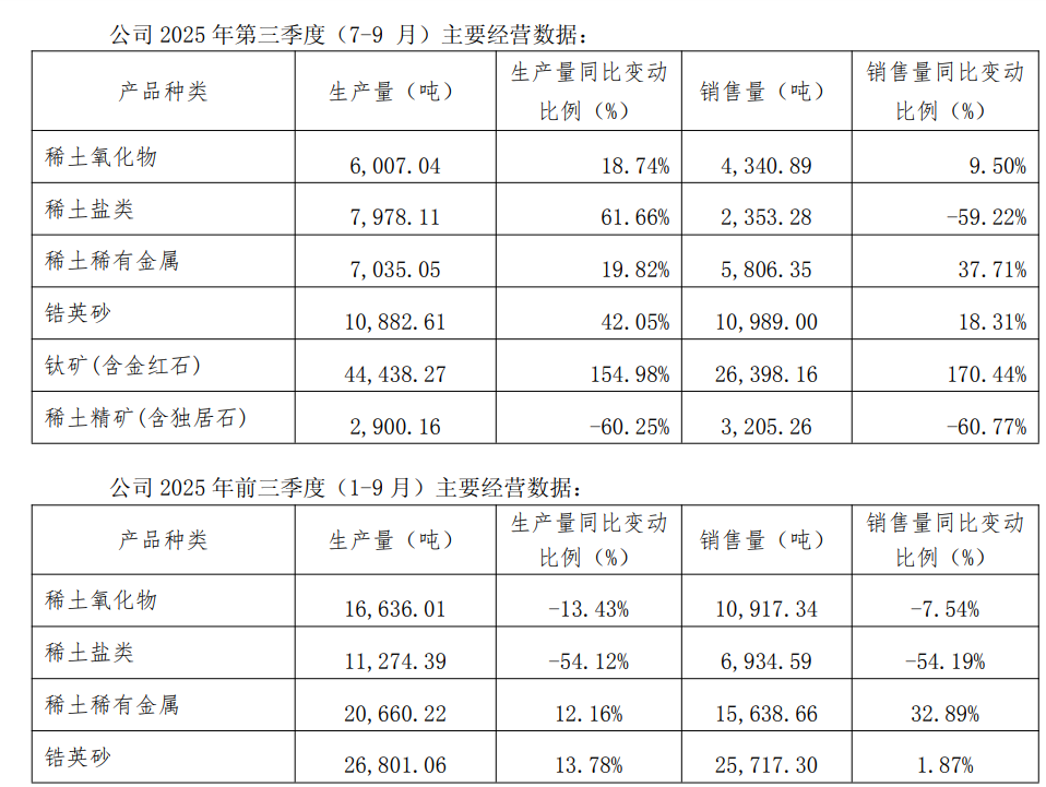 盛和资源还披露了第三季度(7-9 月)及 2025 年前三季度(1-9 月)主要经营数据:
