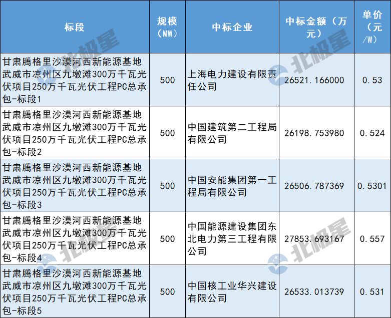 11月7日,甘肃腾格里沙漠河西新能源基地武威市凉州区九墩滩300万千瓦光伏项目250万千瓦光伏工程PC总承包中标结果公布,中标企业为上海电力建设有限责任公司、中国建筑第二工程局有限公司、中国安能集团第一工程局有限公司、中国能源建设集团东北电力第三工程有限公司、中国核工业华兴建设有限公司。