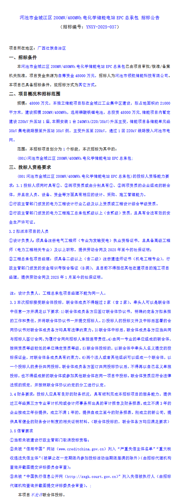 11月7日,河池市领航储能科技有限公司发布河池市金城江区200MW/400MWh电化学储能电站EPC总承包招标公告。