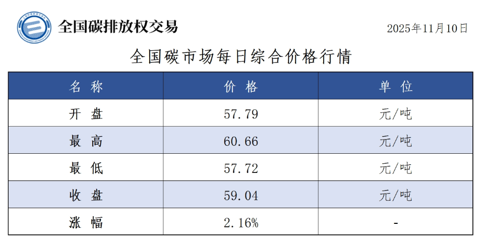 今日全国碳市场综合价格行情为: 开盘价57.79元/吨,最高价60.66元/吨,最低价57.72元/吨,收盘价59.04元/吨,收盘价较前一日上涨2.16%。