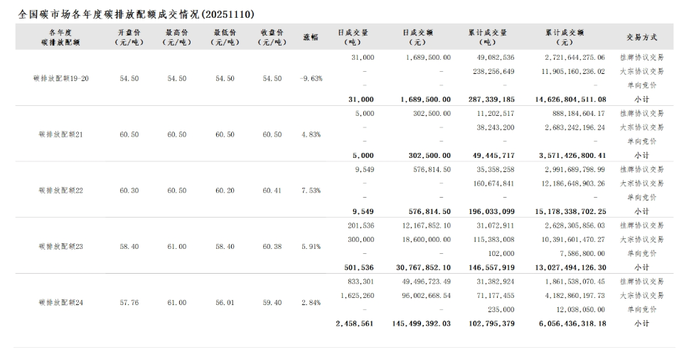 2025年1月1日至11月10日,全国碳市场碳排放配额成交量151,902,635吨,成交额9,427,773,354.71元。