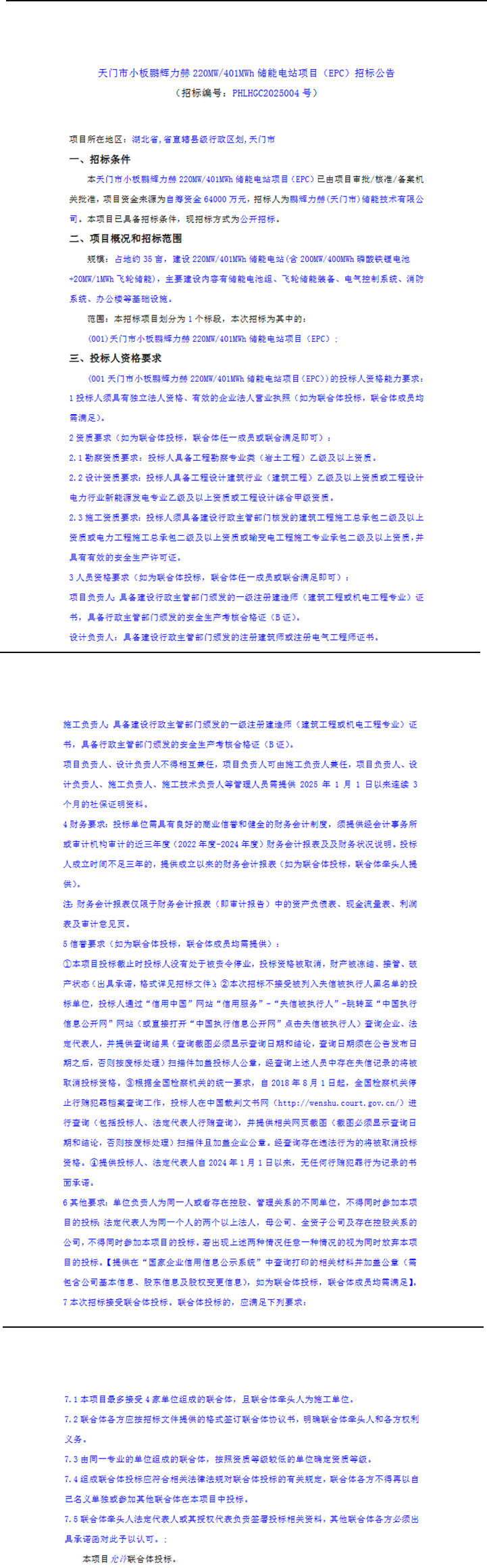 11月10日,据中国招标投标公共服务平台发布,鹏辉力赫(天门市)储能技术有限公司就天门市小板鹏辉力赫220MW/401MWh储能电站项目(EPC)发布招标公告。该项目已由相关部门批准,资金来源为自筹资金64000万元,招标人为鹏辉力赫(天门市)储能技术有限公司,采用公开招标方式。