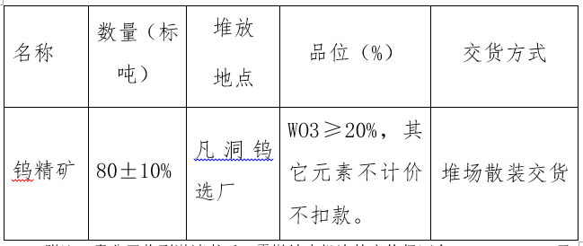 4.竞价方中标后,中标竞价方需与标价方及时签订钨精矿买卖合同。同时,竞价中标方在收到标价方发货通知之日起(含通知当日)尽快将该批货物拉运完毕。
