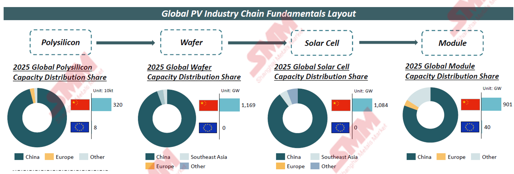 中国是全球唯一一个在光伏全产业链——从多晶硅到组件——拥有全面、大规模生产能力的国家。上图显示了中国在各环节的主导地位,突显其在全球光伏制造业中的关键作用。