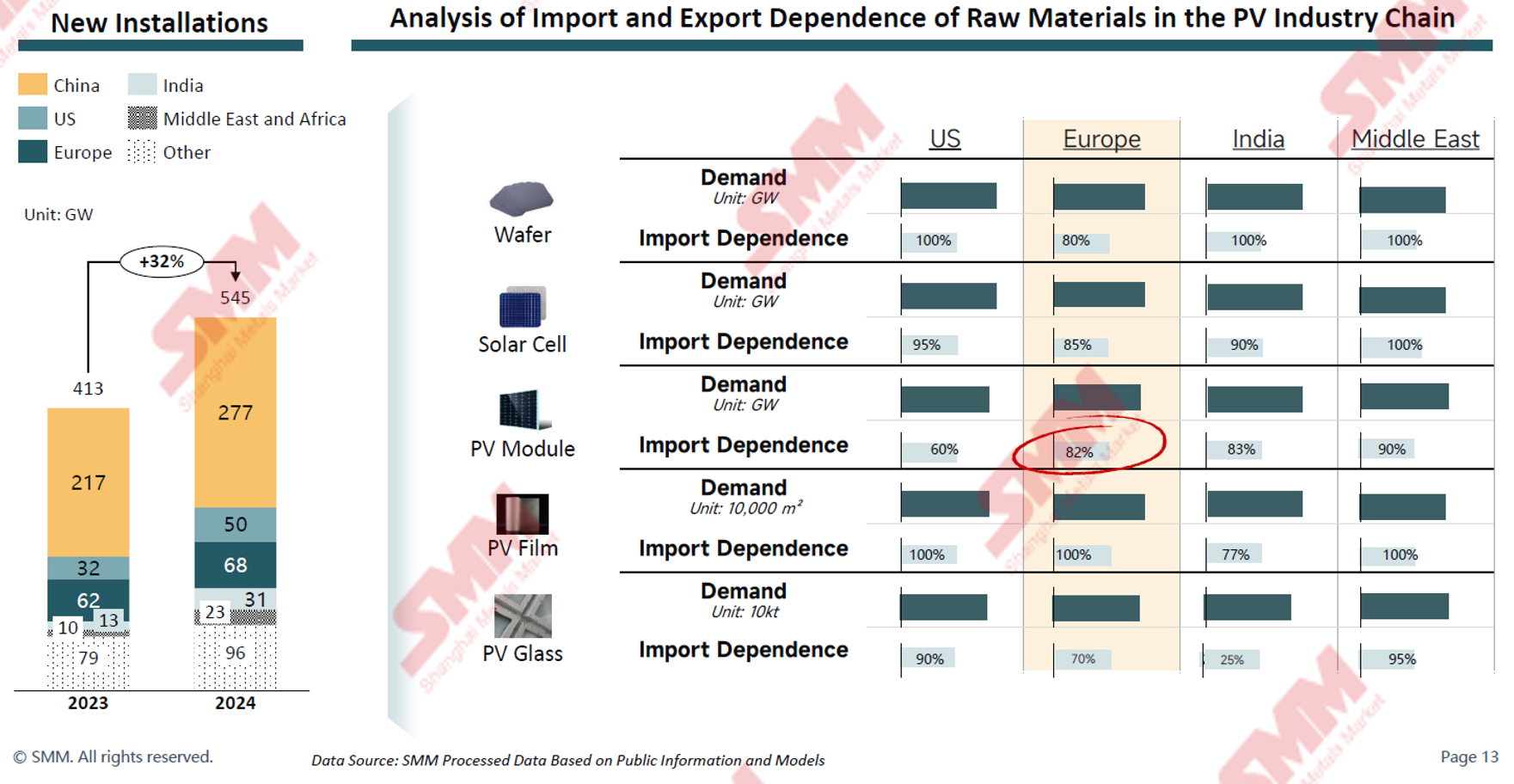 上图展示了光伏组件生产所需原材料的进口依赖情况。海外生产高度依赖上游原材料,而中国在供应链中占据主导地位。这种依赖性给欧洲光伏产业带来风险,尤其考虑到潜在的贸易壁垒和地缘政治因素。