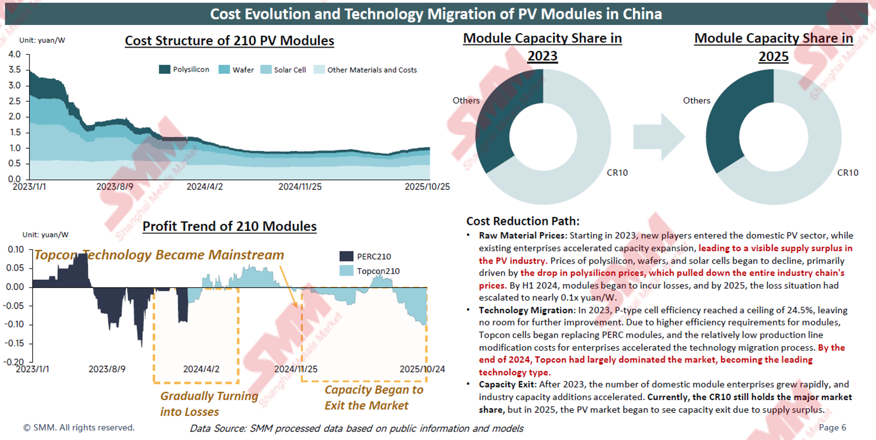 到了2025年中期,受630政策影响,短期内盈利有所改善;然而,装机量下滑和硅料价格回升很快又将组件利润压回低位。目前组件基本处于零利润状态。展望未来,在限价政策、行业自律及供应改善等因素的作用下,SMM预计2026年组件市场将重新转正。值得注意的是,TOPCon 183组件相比210型号来说,其盈利能力较弱,市场需求增长也可能因此放缓。