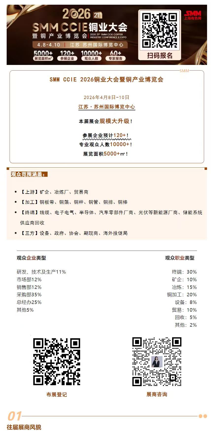 2025 年美国铜半成品加税改写贸易逻辑,精矿紧缺、废铜供应链扰动推高成本,新产能难抵原料争夺。2026 年铜产业将迎原料、加工、消费深度再平衡,本次大会将聚焦铜行业趋势解析与机遇探索。