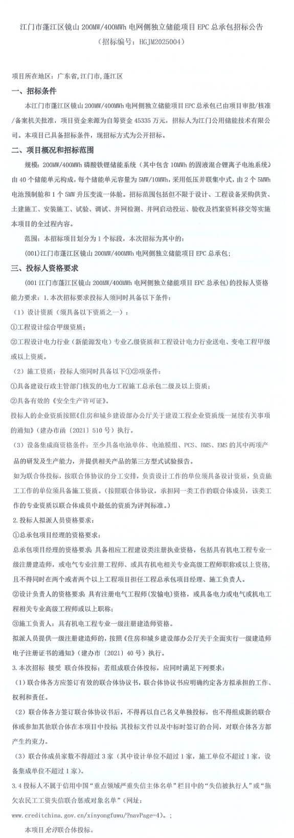11月10日,江门公用储能技术有限公司发布江门市蓬江区镜山200MW/400MWh电网侧独立储能项目EPC总承包招标公告。项目位于广东省江门市蓬江区,项目规模为200MW/400MWh,采用磷酸铁锂储能系统(其中包含10MWh的固液混合锂离子电池系统),由40个储能单元构成,每个储能单元容量为5MW/10MWh,采用低压并联集中式,由2个5MWh电池预制舱和1个5MW 升压变流一体舱。招标范围包括但不限于设计、工程设备采购供货、土建施工、安装施工、试验、调试、并网检测、并网启动投运、验收及档案资料移交等实施本项目的全过程内容。