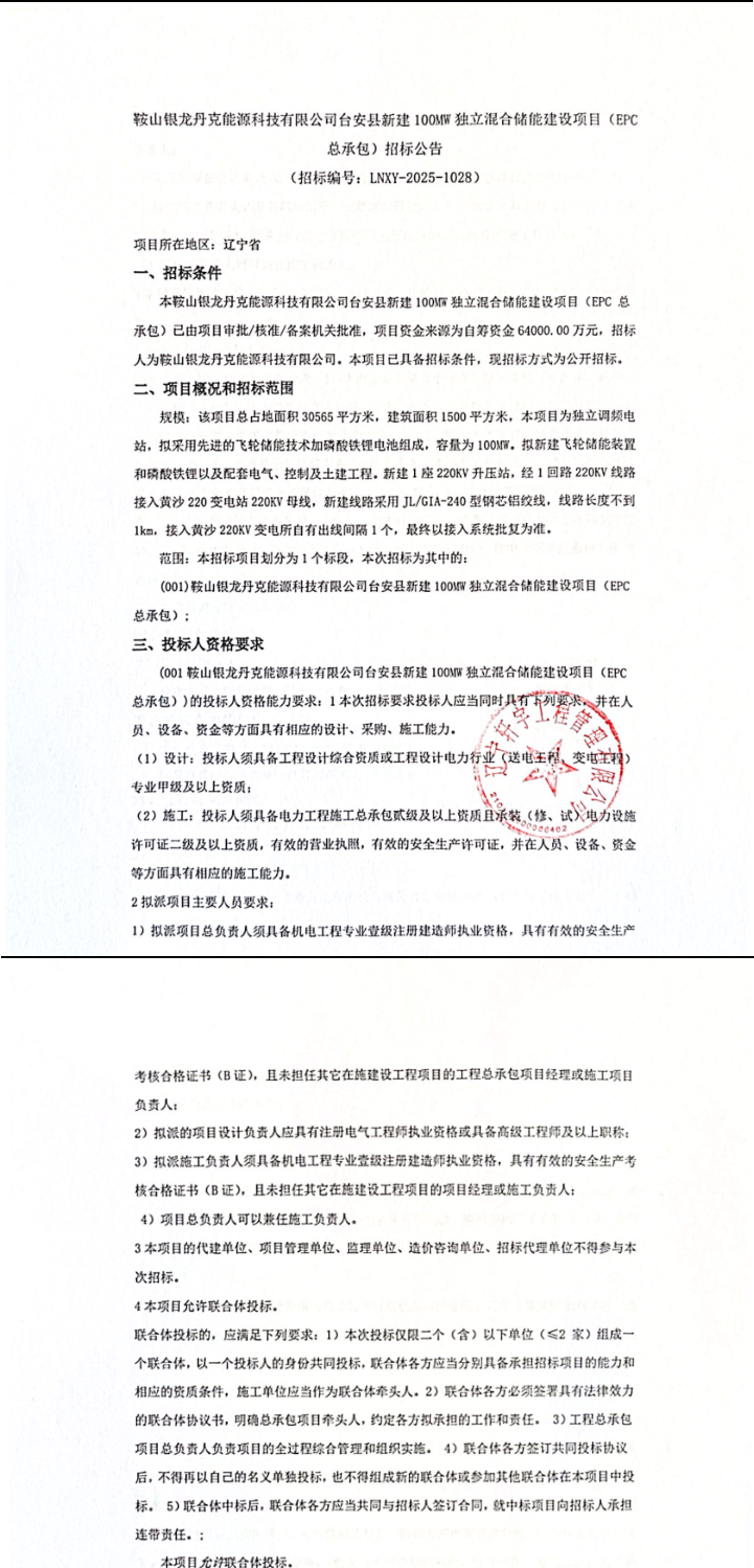 11月11日,北极星储能网获悉,鞍山银龙丹克能源科技有限公司就台安县新建100MW独立混合储能建设项目(EPC总承包)公开招标。