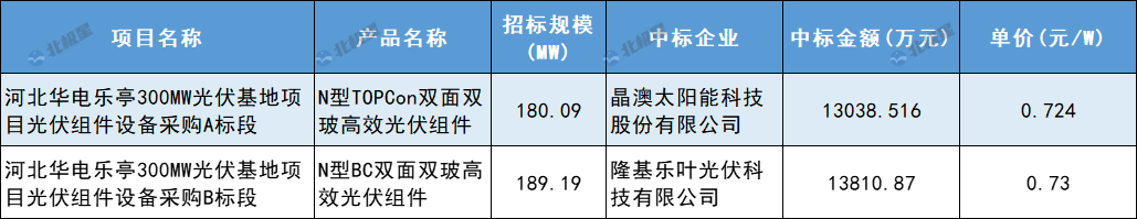 11月11日,河北华电乐亭300MW光伏基地项目光伏组件设备采购(A、B标段)批次评标结果公示,该项目分为2个标段,标段A中标企业有晶澳太阳能科技股份有限公司;标段B中标企业隆基乐叶光伏科技有限公司。