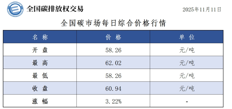 今日全国碳市场综合价格行情为: 开盘价58.26元/吨,最高价62.02元/吨,最低价58.26元/吨,收盘价60.94元/吨,收盘价较前一日上涨3.22%。