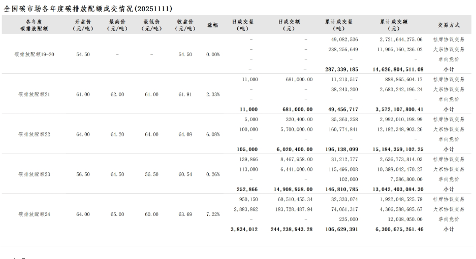 2025年1月1日至11月11日,全国碳市场碳排放配额成交量156,105,513吨,成交额9,693,622,655.99元。