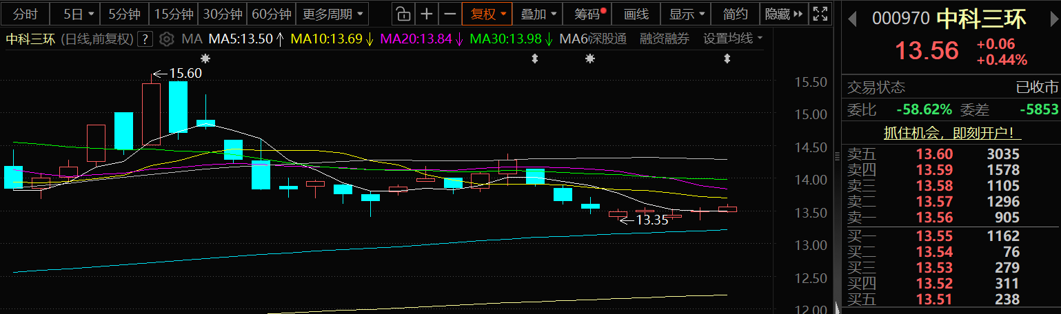 11月12日,中科三环股价出现上涨,截至11日收盘,中科三环涨0.44%,报13.56元/股。