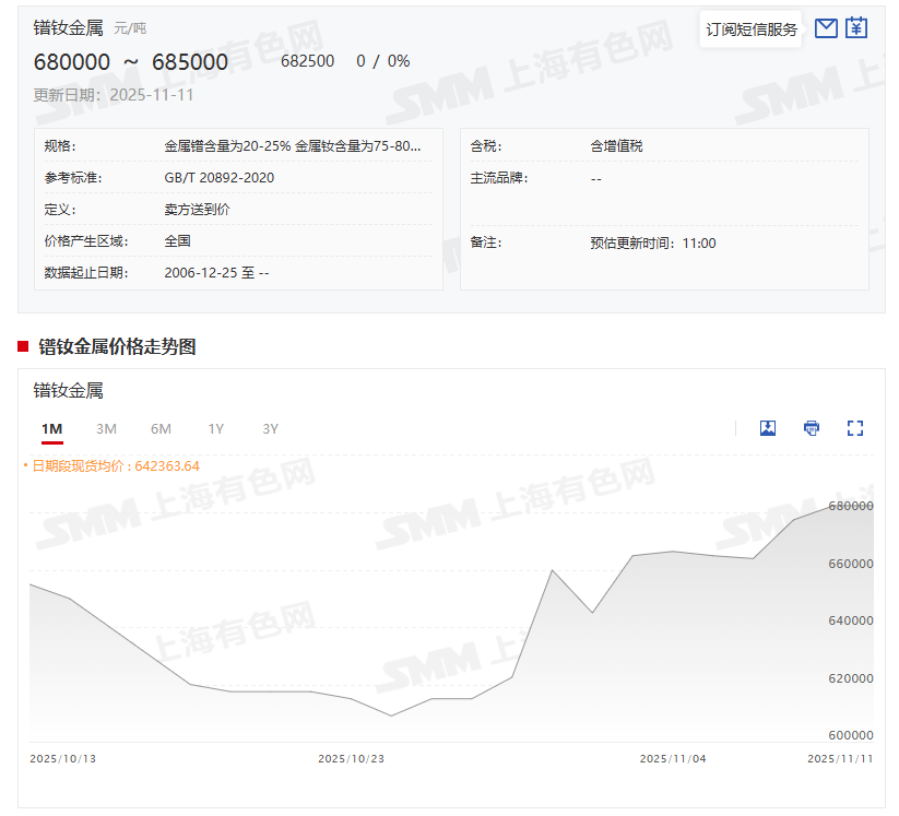 据SMM最新的报价显示:11月11日,镨钕金属价格稳定在68-68.5万元/吨。