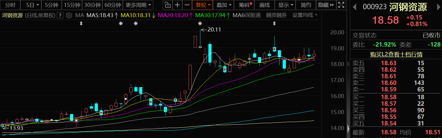 11月12日,河钢资源股价出现上涨,截至12日收盘,河钢资源涨0.81%,报18.58元/股。