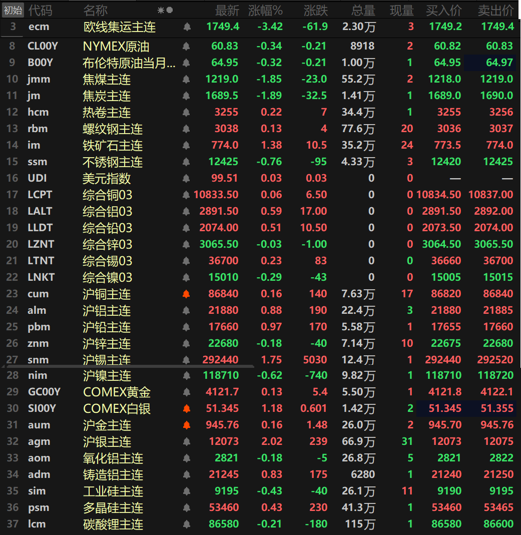此外,碳酸锂主连跌0.21%,多晶硅主连涨0.43%,工业硅主连跌0.43%。欧线集运主连跌3.42%报1749.4。