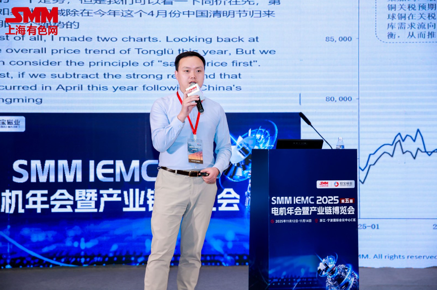 11月12日,在由上海有色网信息科技股份有限公司(SMM)主办,宁波招宝磁业股份有限公司总冠名的SMM 2025 IEMC(第五届)电机年会暨产业链博览会——主论坛上,SMM行业研究部GM叶建华围绕“电机原材料——铜铝金属价格和市场分析”这一主题展开了论述。