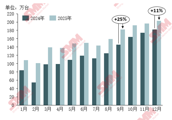 Ø2025年驱动电机市场呈现强劲且稳健的整体增长态势,乘用车电驱动消费量从1月的80万台稳步上升至12月的145万台,全年增长月81%,整体上与新能源车月销量趋势保持一致。