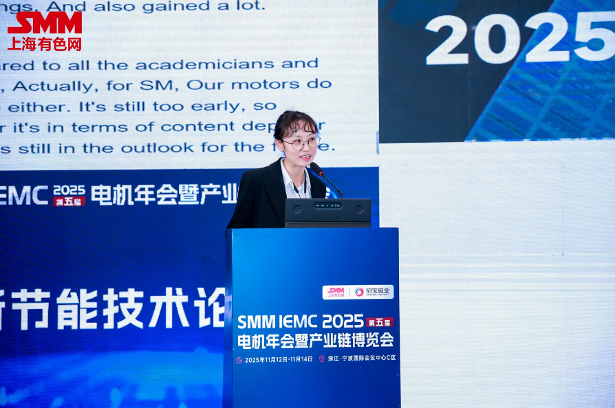 11月13日,在由上海有色网信息科技股份有限公司(SMM)主办,宁波招宝磁业股份有限公司总冠名的SMM 2025 IEMC(第五届)电机年会暨产业链博览会——电机创新节能技术论坛上,SMM电机/稀土分析师史鑫分享了“2025年国内汽车驱动电机消费分析及后市展望”。