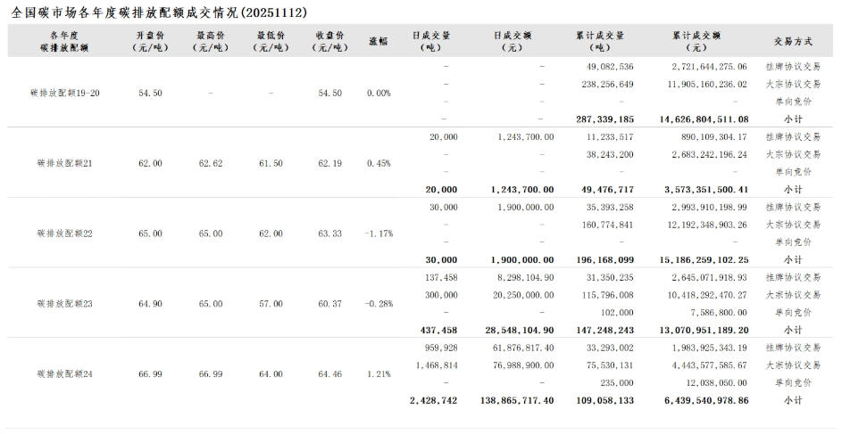 2025年1月1日至11月12日,全国碳市场碳排放配额成交量159,021,713吨,成交额9,864,180,178.29元。