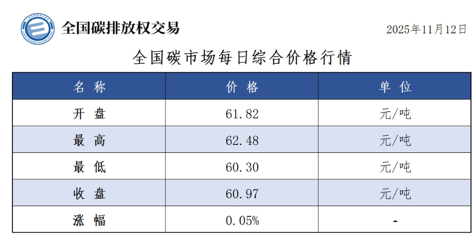 今日全国碳市场综合价格行情为: 开盘价61.82元/吨,最高价62.48元/吨,最低价60.30元/吨,收盘价60.97元/吨,收盘价较前一日上涨0.05%。