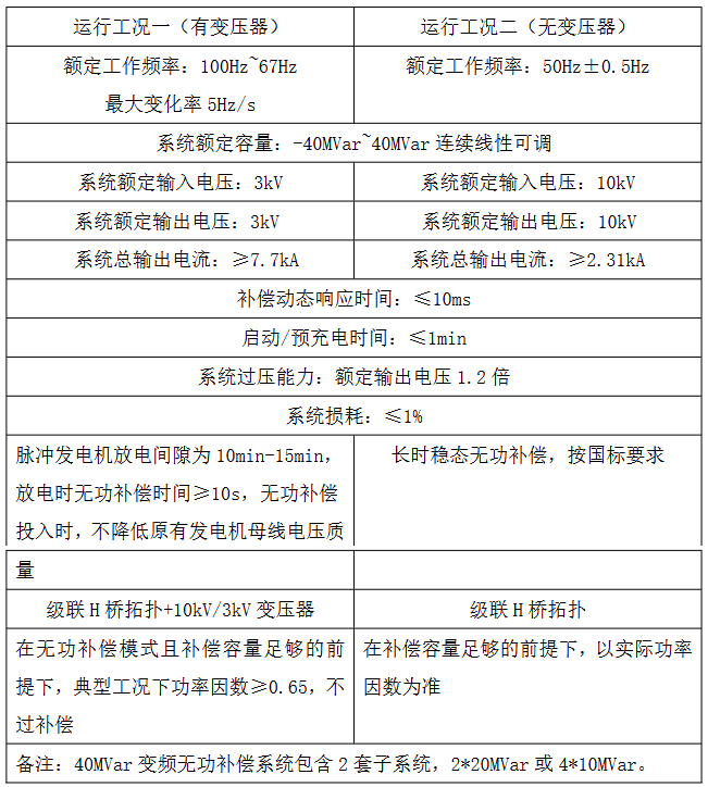 采购需求为40MVar变频无功补偿系统,包含 2 套子系统,可以为2*20MVar或4*10MVar。招标文件按有无变压器提出了两种工况参数要求。