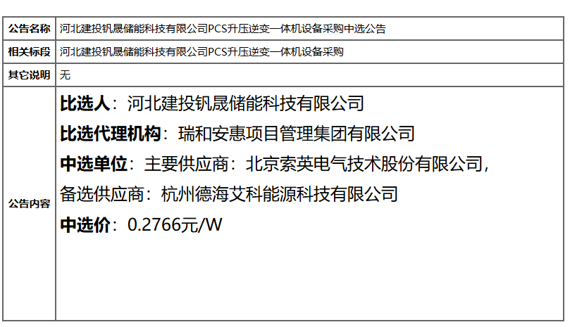 北极星储能网获悉,11月10日,河北建投钒晟储能科技有限公司PCS升压逆变一体机设备采购中选公告发布,项目规模预计15MW/60MWh,主要中选供应商为北京索英电气技术股份有限公司,中选价0.2766元/W,备选供应商为杭州德海艾科能源科技有限公司。