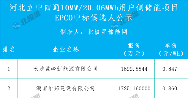 第二中标候选人为湖南华邦建设有限公司,投标报价1725.16万元,折合单价0.860元/Wh。