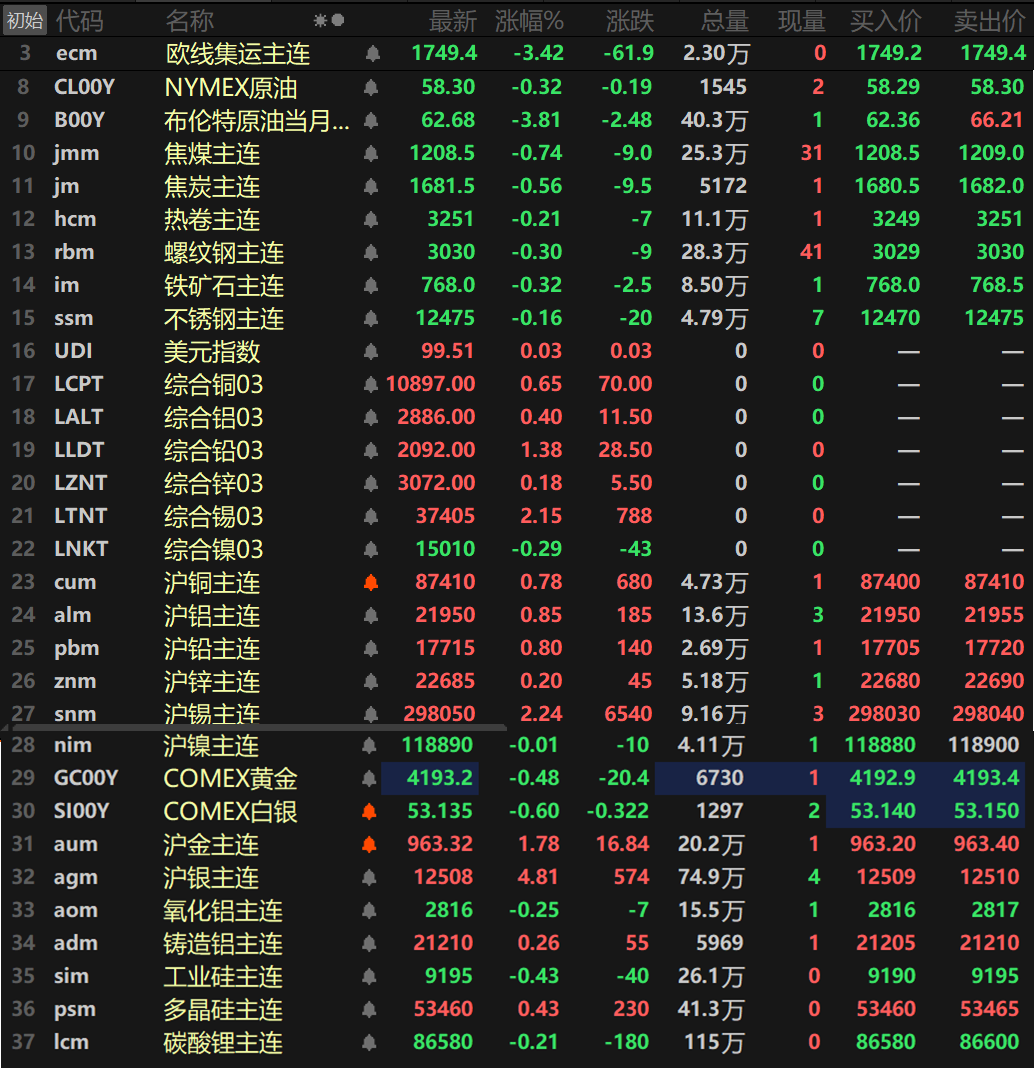 隔夜内外盘金属普涨,仅伦镍和沪镍一同下跌,伦镍跌0.29%,沪镍跌0.01%。伦锡、沪锡一同涨逾2%,伦锡涨2.15%,沪锡涨2.24%,沪锡盘中最高冲至298500元/吨,刷新4月3日以来的新高;伦铅涨1.38%,其余金属涨幅均在1%以内。氧化铝主连跌0.25%,铸造铝主连涨0.26%。