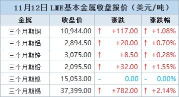 伦敦时间11月12日17:00(北京时间11月13日01:00),LME三个月期铜上涨117美元,或1.08%,收报每吨10,944.0美元。由于包括印尼事故在内的矿山供应中断造成的供应短缺,铜价在上个月创下了11,200美元的历史新高。