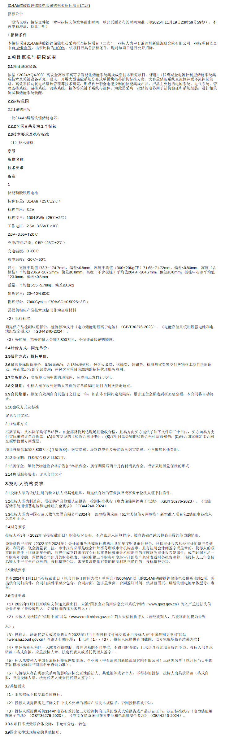北极星储能网获悉,11月12日,中石油深圳新能源研究有限公司发布314Ah磷酸铁锂储能电芯采购框架招标项目,拟采购最大金额800万元,最高投标限价单价0.34元/Wh。