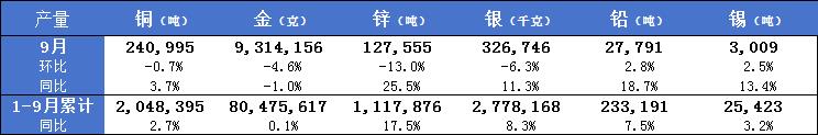 秘鲁能源与矿业部发布的数据显示,秘鲁9月铜产量同比增加3.7%,至240,995吨。