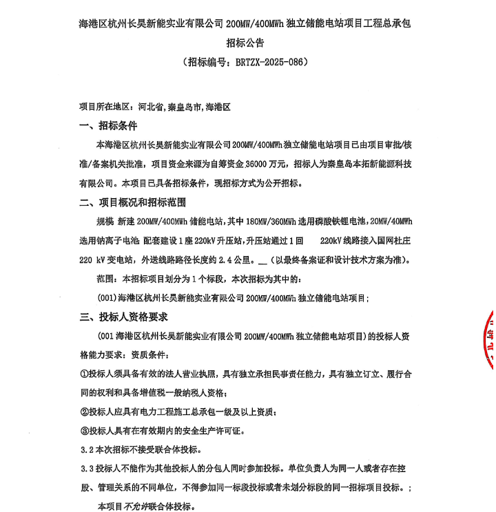 11月13日,海港区杭州长昊新能实业有限公司200MW/400MWh独立储能电站项目工程总承包招标公告发布,项目落地河北省秦皇岛市海港区,总投资3.6亿元,资金来源为自筹,招标人为秦皇岛本拓新能源科技有限公司,招标方式为公开招标。