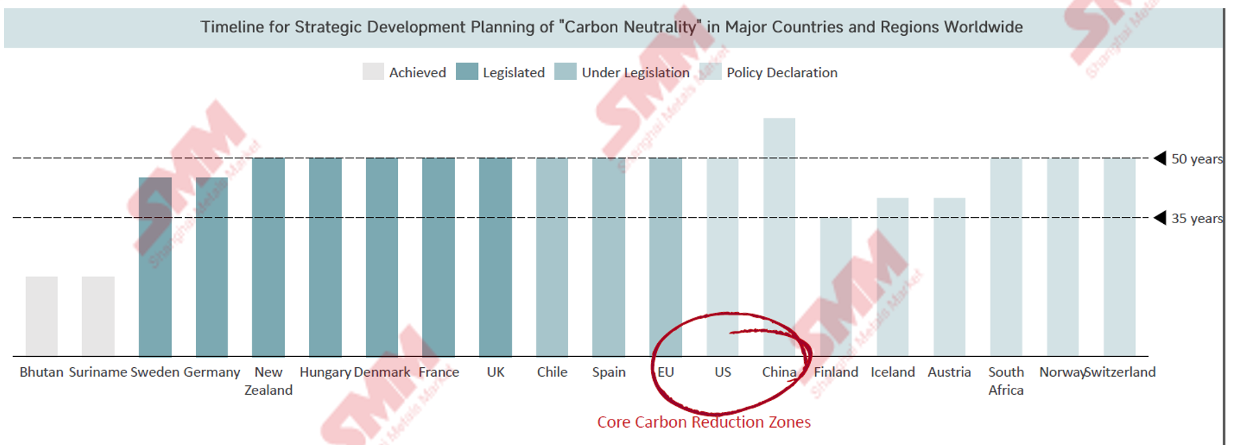 全球各国正在实施碳减排和碳中和行动。截至目前,已有约190个国家签署《巴黎协定》。到2030年,中国、美国和欧盟的减排目标均超过50%,作为经济强国,中国、美国和欧盟将成为长期核心碳减排区域。