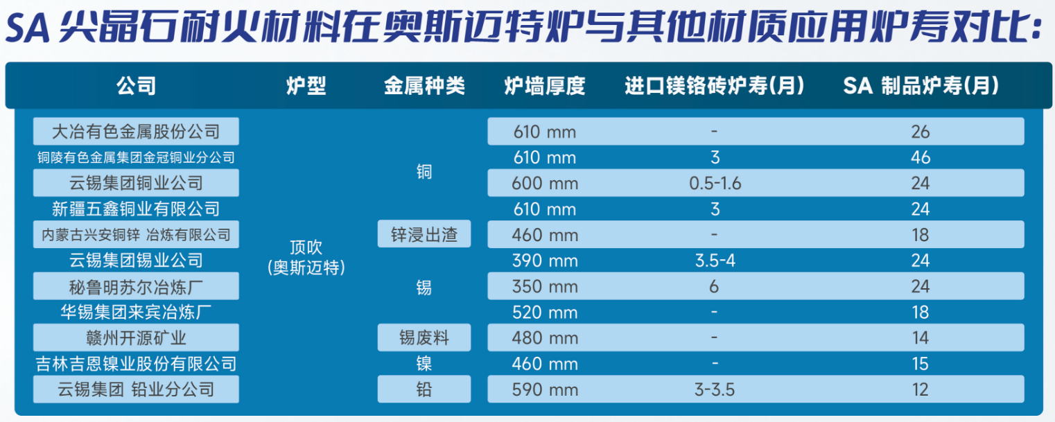 铜陵金冠冶炼公司,奥斯迈特炉,SA 尖晶石砖使用炉寿已达 46 个月。