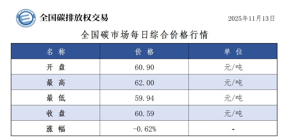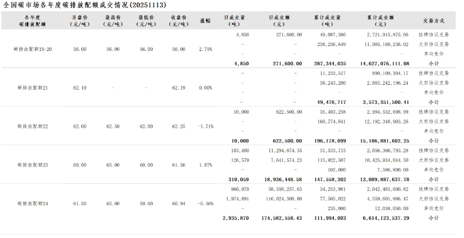 2025年1月1日至11月13日,全国碳市场碳排放配额成交量162,282,492吨,成交额10,058,593,285.30元。